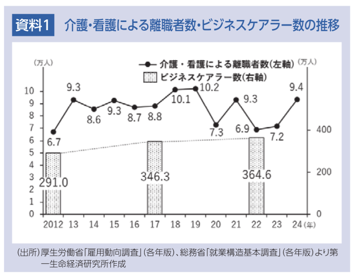 厚生労働省の調査によると、近年「介護・看護」を理由とする離職者数は7~10万人で推移しています。また、総務省の調査によると、介護をしながら仕事を続ける人(ビジネスケアラー)の数は増加傾向にあり、2022年には364.6万人となりました(資料1)。高齢化が進む中、介護による離職や就労継続の難しさは社会問題化してきています。