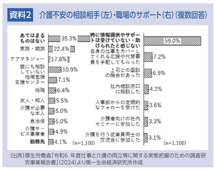 従業員が職場に介護の悩みを相談しない理由は必ずしも1つではありませんが、ここでは一因として「職場に相談しても状況は変わらないと従業員が感じている」可能性について考えてみます。厚生労働省の調査によると、介護開始後に職場から受けたサポートとして最も多かったのは「受けていない・助けられたと感じない」で、割合は59.0%でした(資料2右図)。この結果を企業目線から考えると、介護の悩みを抱える従業員の支援制度が職場に「ない」「役立たない」という設計上の問題と、制度はあるが「周知できていない」「利用されにくい」という運用上の課題が浮かんできます。