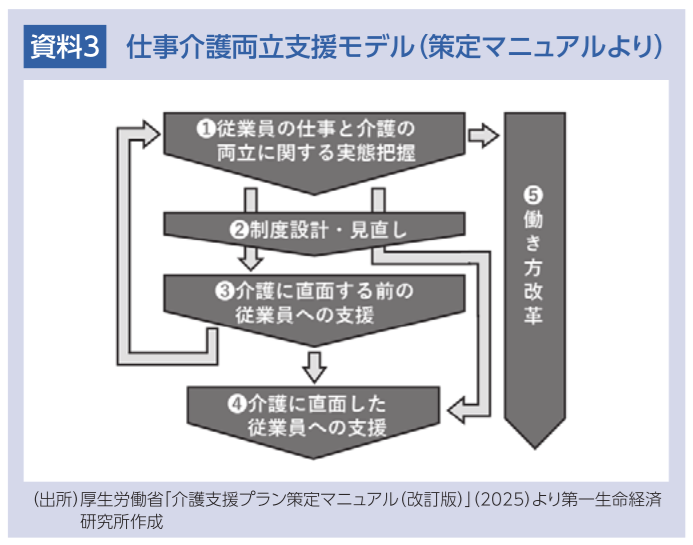 厚生労働省は2025年に企業向けの「介護支援プラン策定マニュアル(改訂版)」を公表しています。ここでは、企業は日ごろから①~⑤に取組む必要があると示されています(資料3)。制度が「ない」「役立たない」状況は、①に基づき②のとおり制度の創設と定期的な見直しを行うことで改善が見込まれます。また、制度を「周知できていない」「利用されにくい」事態は、①③④を通じて制度を普及し、従業員と介護について継続的に対話することで打破が期待できます。⑤働き方改革の中で支援モデルのサイクルを循環させ、従業員が職場に相談する意味を感じる支援制度を設計・運用していくことは、「介護の悩みが職場に相談されない」状況を改善するための第一歩かもしれません。