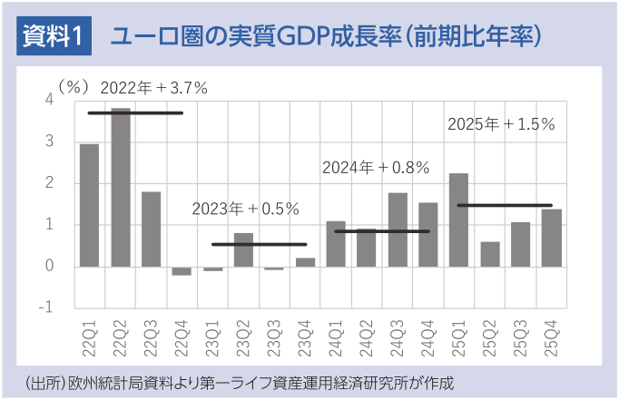 ユーロ圏経済は、米国による関税引き上げ前の駆け込み輸出の反動減を乗り切り、回復基調を続けている。2025年の成長率は+1.5%と、過去2年の低成長を脱し、潜在成長率並みに復帰した。欧州復興基金からの資金拠出、観光需要、移民の流入増加、多国籍企業による経済活動などに支えられ、スペイン、ギリシャ、アイルランドなど、かつての債務不安国が引き続き景気拡大を支えている。構造不況に陥ったドイツも、インフラ投資や防衛費を中心に大規模な財政拡張に舵を切り、マイナス成長を脱した。政権延命と予算成立で、フランスの財政不安も小康状態にある。