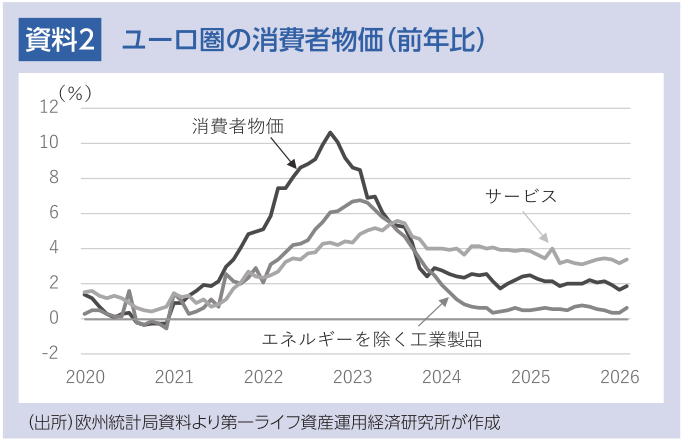 こうした景気回復シナリオに対する不安要素が中東情勢だ。米国によるイラン攻撃を受け、金融市場の動揺や商品市況の上昇が続いている。事態は流動的だが、混乱が長期化した場合、ユーロ圏の景気を下押しするとともに、物価を押し上げる。