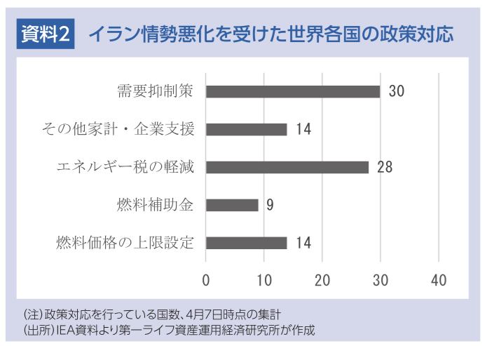 2022年のロシアによるウクライナ侵攻時には、資源価格高騰による家計や企業への打撃を緩和するため、欧州各国が巨額の財政支援を行った結果、政府債務の膨張を招いた。今回は財政余力が乏しいこともあり、欧州委員会は加盟国政府に対して、補助金支給、減税、価格上限などの政策支援の規模や期間を限定するように呼びかけている。財政支援を可能にするため、一部の加盟国は、価格高騰の恩恵を受けるエネルギー企業への課税強化や、財政規律の柔軟運営を求めている。