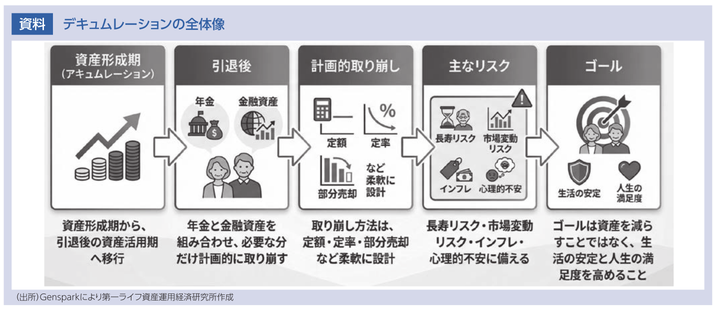 デキュムレーション(decumulation)とは、資産形成期に積み上げてきた金融資産を、引退後やセカンドライフにおいて計画的に取り崩し、生活費や目的資金として活用していくプロセスを指す(資料)。積立(アキュムレーション)の反対概念であり、「いくら増やすか」ではなく「いつ・どのくらい・どの順番で使うか」が核心となる。具体的には、年金受給と金融資産の取り崩しの組み合わせ、定額・定率の引き出し方法、運用を続けながらの部分的取り崩しなどが含まれる。「退職後、毎月いくら取り崩せば安心して暮らせるのか」、多くの人が直面するこの問いに答える考え方がデキュムレーションである。デキュムレーションは、単なる「資産の消費」ではなく、人生後半の選択肢を支える戦略的マネジメントだといえる。