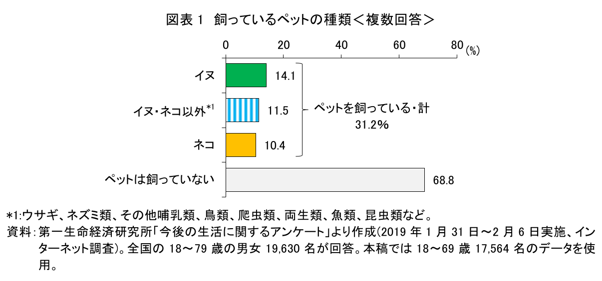 当研究所が2019年はじめに行った調査によると、ペットを飼っている人は18~69歳の回答者全体の約3割で、最も多くあげられたペットの種類は「イヌ」(14.1%)であった(図表1)。
