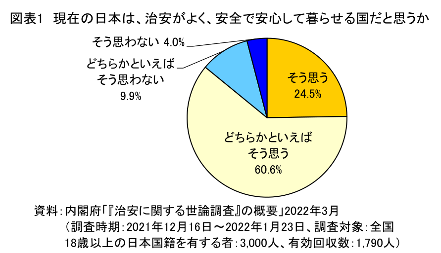 内閣府が昨年の終わりから今年の初めにかけて実施した調査においても、「現在の日本が治安がよく、安全で安心して暮らせる国」だと思う(「そう思う」「どちらかといえばそう思う」の合計)と答えた人は85.1%にのぼった(図表1)。夜道を安心して歩けることに象徴されるように、大半の人は日本が治安の良い国だと思っていることがわかる。