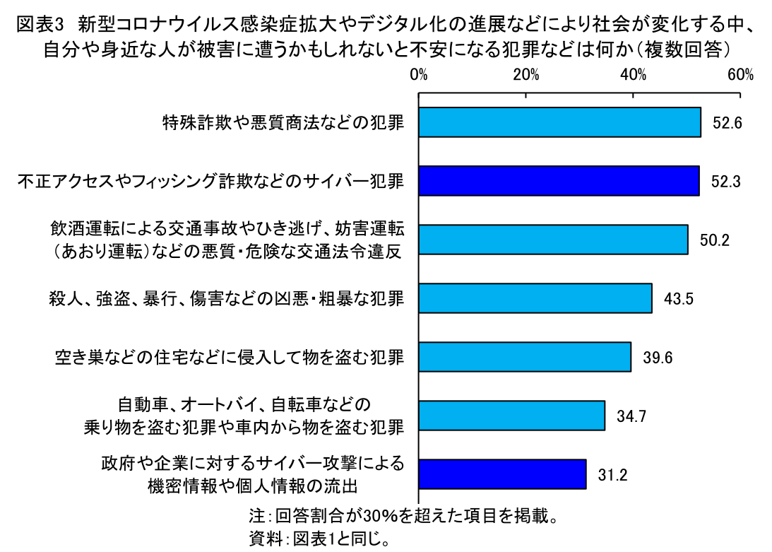 また、自分や身近な人が被害に遭うかもしれないと不安になる犯罪などを質問した結果では、「特殊詐欺や悪質商法などの犯罪」(52.6%)、「不正アクセスやフィッシング詐欺などのサイバー犯罪」(52.3%)が1・2位にあがった(図表3)。いずれも電話やインターネットを用い、いわば非リアルな空間を中心としておこなわれる犯罪である。日本人の不安は今や、リアルな空間以上に非リアル空間の犯罪にあるといえる。