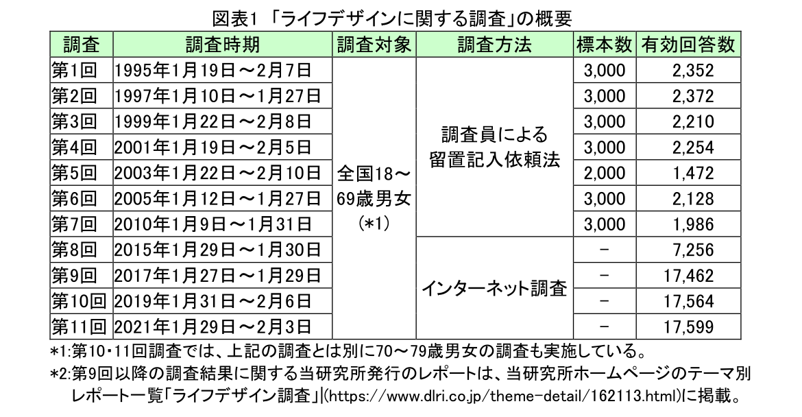 当研究所では、1995年から11回にわたって実施している大規模な生活者調査「ライフデザインに関する調査」(図表1)をはじめ、多分野における調査研究を通じて、人々の幸せのあり方を見つめ続けてきた。特に近年では、幸せ・well-beingに焦点を当てた調査研究に取り組み、書籍「人生100年時代の「幸せ」戦略」「「幸せ」視点のライフデザイン」(注2)やレポート(注3)などにおいてその成果をまとめている。