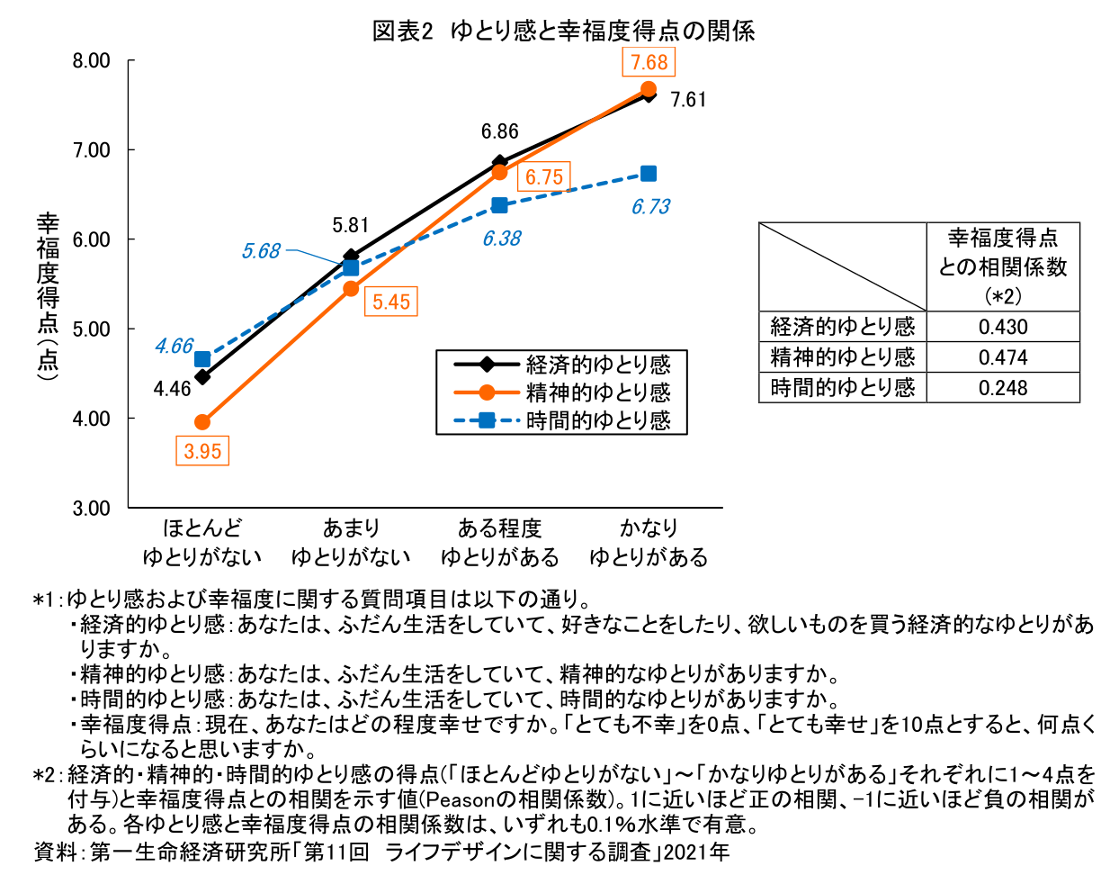 この調査では、経済的・精神的・時間的ゆとり感に関して、それぞれ「かなりゆとりがある」「ある程度ゆとりがある」「あまりゆとりがない」「ほとんどゆとりがない」の4段階のどれにあてはまるかを質問している。また、幸せに関しては、「とても不幸」0点~「とても幸せ」10点の11段階でその程度を尋ねている。図表2には、経済的・精神的・時間的ゆとり感の程度別の幸福度得点(幸せの程度)の平均点、ならびに各ゆとり感と幸福度得点との相関を示す。