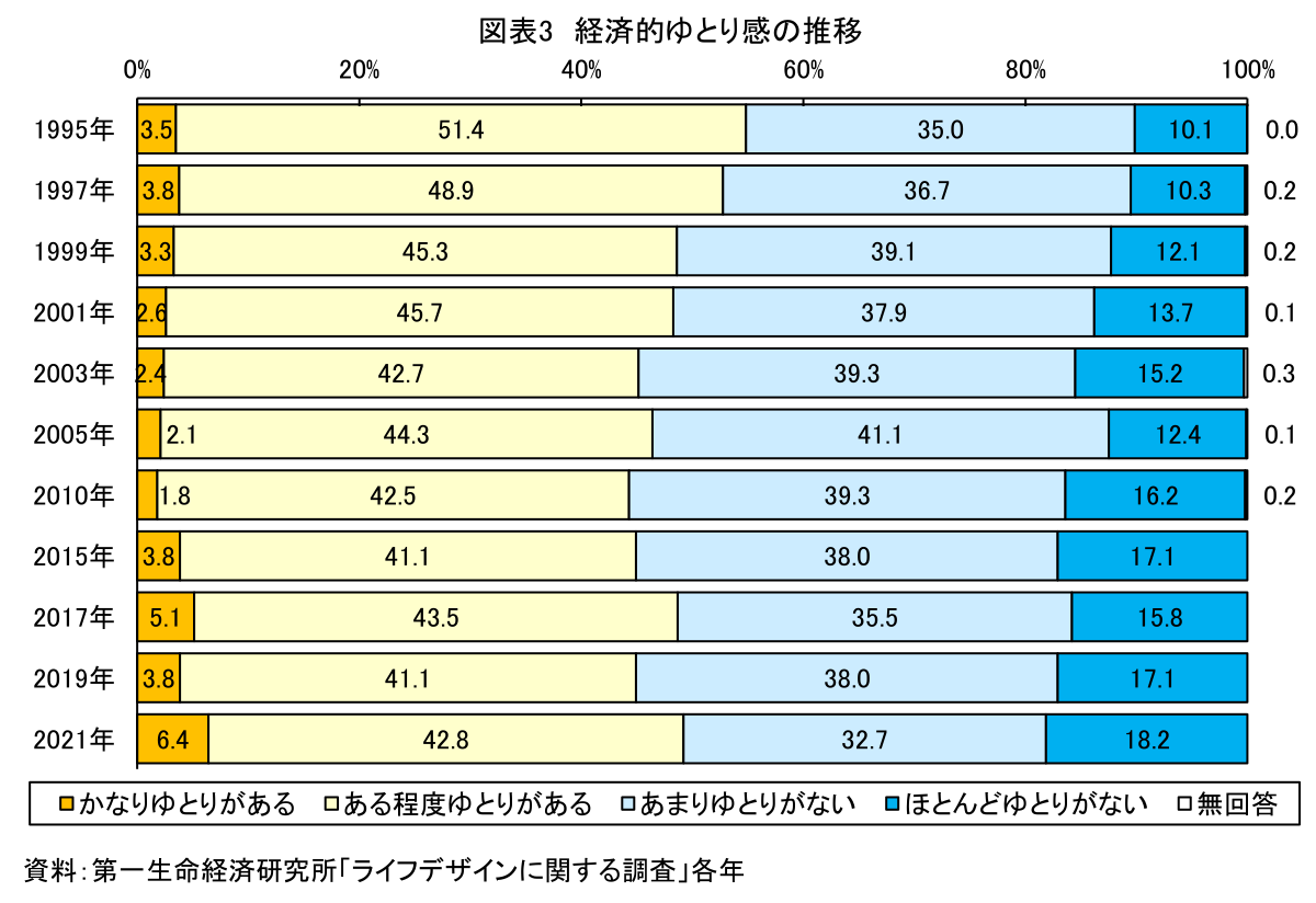 それ以降、『ゆとりがある』と答えた割合はさほど変化していないが、注目すべきは「ほとんどゆとりがない」と答えた割合がかつてより増えており、2021年ではこれまでで最も高い18.2%を記録したことである。一方で「かなりゆとりがある」と答えた割合も、2021年にはこれまでで最も高い6.4%となっている。