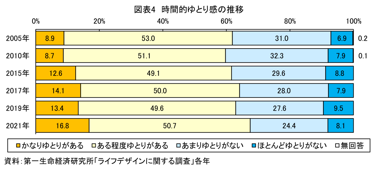 次に、時間的ゆとり感の推移を図表4に示す。『ゆとりがある』と答えた割合は、2005年から2019年の間にはさほど大きな変化がなかったが、2019年から2021年にかけては5ポイント近く増えた。新型コロナウイルスの感染拡大の影響で、仕事・通勤時間や外出する時間などが減ったことなどにより、時間的なゆとりが全体的に増えたと思われる。