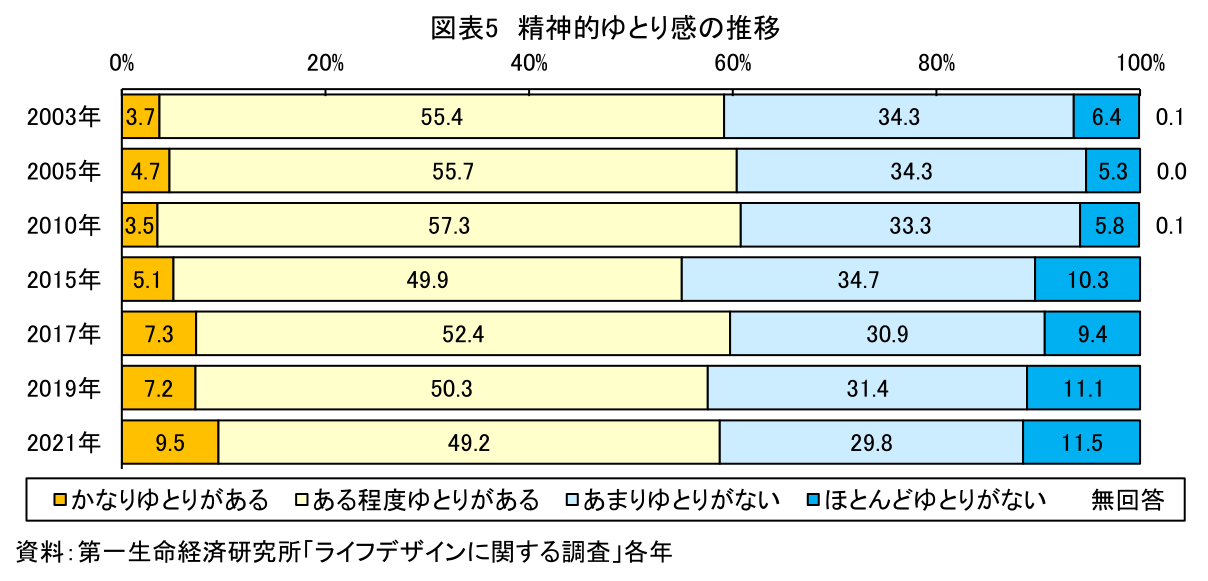 一方、精神的ゆとり感について図表5でみると、『ゆとりがある』と答えた割合は、2003年から2021年までの間、概ね6割前後で推移している。だが、両端の「かなりゆとりがある」と「ほとんどゆとりがない」はいずれも増える傾向にあり、2021年ではそれぞれ9.5%・11.5%と、いずれも過去最高を記録している。前述の経済的ゆとり感の格差とともに、精神的ゆとり感の格差も広がりつつあるといえる。