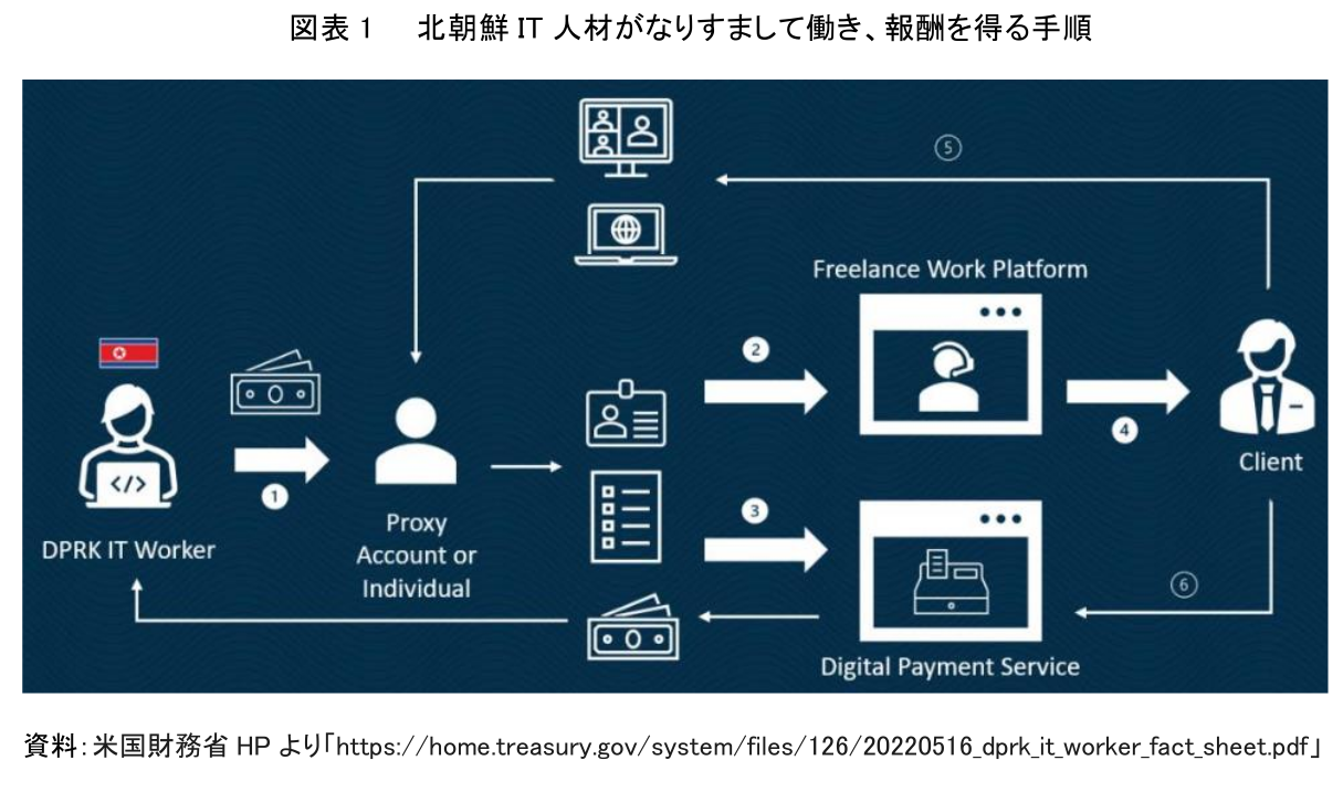 実際、北朝鮮IT人材が身元を隠し、リモートワーカーとして働くためのなりすましは巧妙化している。米国国務省によると、北朝鮮のなりすましIT人材がどのようにして報酬を得ているのかが明らかとなっており、その全体像は6工程から構成されている(図表1)。最初に、北朝鮮のIT人材は、身元を曖昧にするプロキシと呼ばれる仕組みを利用する。プロキシを利用することによりインターネット上における身元が曖昧になる状態を創り出せる。次に、フリーランスプラットフォームにアカウントを開設し、不正または改ざんされた身分証明書や資格情報を提出する。また、デジタル決済サービスのアカウントを開設し、不正に変更された身分証明書や認証情報を提出する。これらの不正行為により他人に成りすましたIT人材は、フリーランスプラットフォーム上で顧客から仕事を受注し、パソコンを通じて顧客との業務コミュニケーションを始める。仕事が完成すると、なりすましに気づかない顧客は、不正に開設された口座とは知らずに報酬を支払ってしまう。
