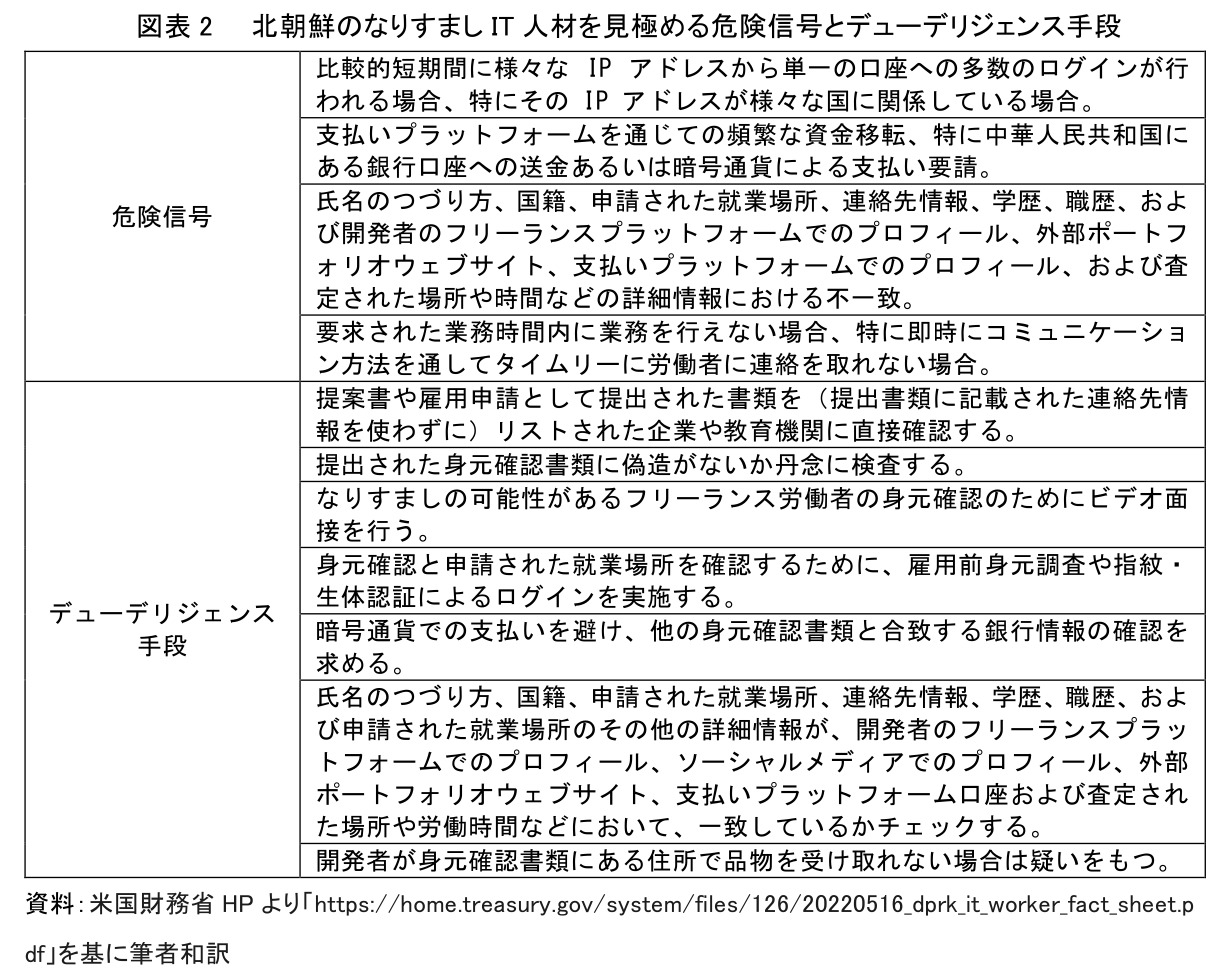ガイダンスの中では、これらのなりすましリモートワーカーを見極めるための方法として、北朝鮮IT人材が活動している可能性を示す4つの「危険信号」と、企業が不用意に北朝鮮IT人材を雇用することを防ぐ7つの「デューデリジェンス手段(取引先の価値やリスクなどを調査すること)」が明示されている(図表2)。