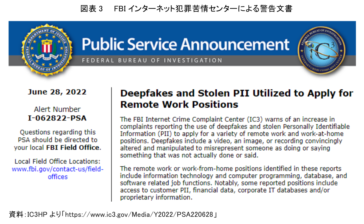 また、米国政府は、高度化するなりすましの実態についても報告している。高度化するなりすましの事例として、FBIインターネット犯罪苦情センター(以下FBI)は、顔や声を他人になりすまし、企業のオンライン面接を経て雇用されるIT人材の存在を挙げている。FBIによる警告は、2022年6月28日に公開されている(図表3)。その概要は、様々なリモートワークや在宅勤務の職種に応募するために、他人になりすませる技術であるディープフェイクと盗まれた個人識別情報を使用し、企業の面接を受ける応募者が増加している現状があると警告している。ディープフェイクとは、ビデオ、画像、音声などを利用し、オンライン上の表情や声色を改変・操作し、第三者になりすますことが可能な技術である。ディープフェイクを活用するオンライン面接では、カメラで撮影された面接者の動作や唇の動きが、話している人の音声と完全に一致しておらず、また、咳やくしゃみなどの聴覚的な動作と、視覚的な動作が一致しないことがあると指摘している。この警告文書の中では、リモートワークや在宅勤務の対象となる職種として、情報技術、コンピュータープログラミング、データベース、ソフトウェア関連などが挙げられている(注3)。