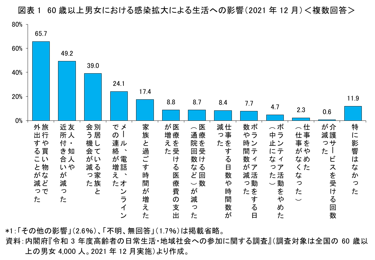 感染拡大が第6波を迎える直前の昨年12月に行われた調査によると、60歳以上の男女が経験したコロナ禍による生活の変化のうち最も多くの人があげたのは「旅行や買い物などで外出することが減った」(65.7%)という点で、これに「友人・知人や近所づきあいが減った」(49.2%)、「別居している家族と会う機会が減った」(39.0%)など他者との付き合い・会合に関することが続いた(図表1)。これらの回答は、ふだんどの程度外出や付き合い、会合の機会があったかや、付き合いのある別居の家族や友人・知人の数等によっても異なってくる。このため増減だけで影響の大きさをとらえるのは難しい面もあるが、後者2項目のいずれかに該当すると答えた「他者との付き合い・会合の機会が減った」とする人の合計割合は65.0%と、「旅行・買い物などで外出することが減った」とした人とほぼ同じ水準であった。