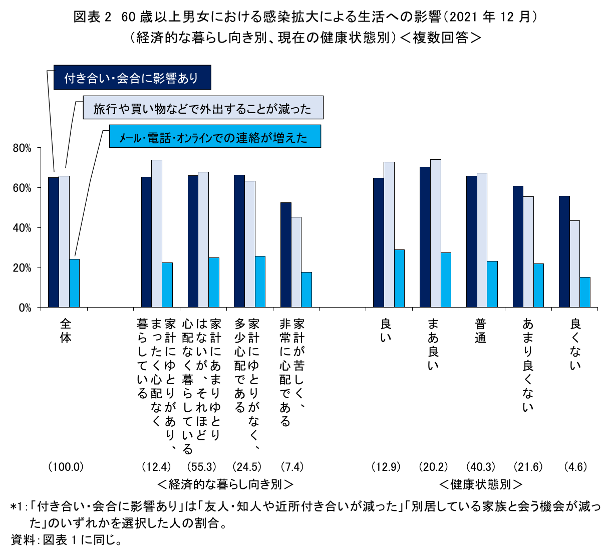 ただ、先に見たコロナ禍による生活の変化についてのシニア世代の回答には、回答者の経済的な暮らし向きや自身の健康状態への評価による違いもみられる。「家計が苦しく、非常に心配である」と答えた人や健康状態について「良くない」と答えた人でも、「旅行・買い物などで外出することが減った」「付き合い・会合に影響あり」という人が半数を超える一方、「電話、メール、オンラインでの連絡が増えた」という人が2割を下回って他のグループに比べ少ない傾向にある(図表2)。このような人では、家計や健康面に不安のない人に比べ変化の幅は小さいものの、お金や健康面の不安を相談できる人や、気軽に情報交換をおこなう機会が少ない人もいると考えられる。外出の頻度や情報機器の利用状況、家族や友人・知人との付き合い等にもよるが、感染者数が再び増加したことで体調の変化等への不安を感じやすくなっている人もいるのではないか。