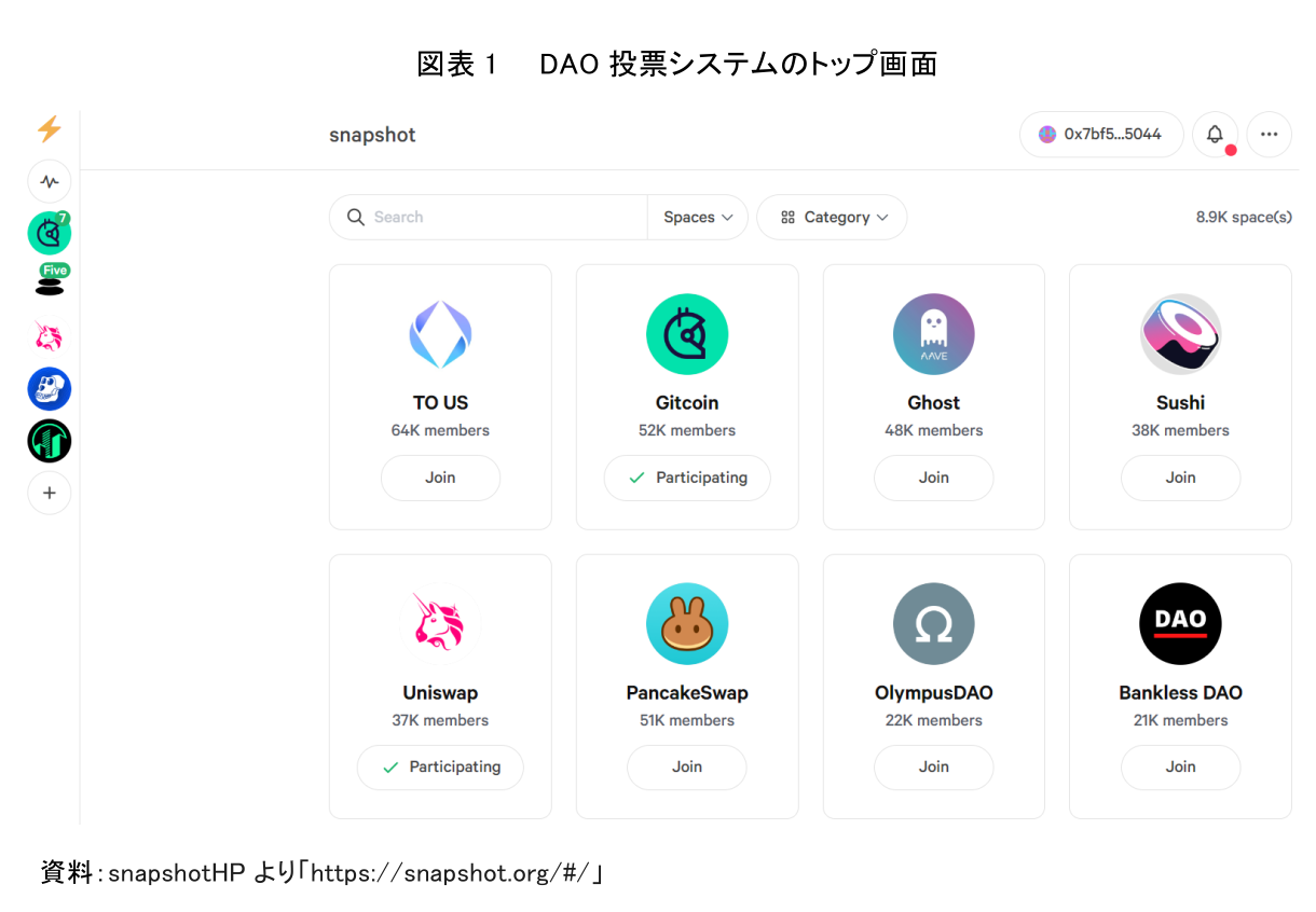 現時点でDAOを運営する事業体の多くは、暗号資産、NFT、ブロックチェーンを事業の中核に据えている。DAOの組織数は増加しており、それに伴いDAOにおける提案数、投票数も増加している。このような中、DAOの提案・投票が行われる場として、暗号資産を議決権として活用する「DAO投票システム」の利用が進んでいる。「DAO投票システム」とは、DAOにおける提案内容や投票結果に関連する作業工程を透明化、効率化する意思決定システムである。2022年8月下旬現在、「DAO投票システム」に登録されているDAOの数は約8,900となっており、増加の一途をたどっている(注1)。