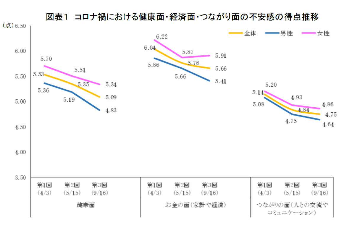 「新型コロナウイルスによる生活と意識の変化に関する調査」は、2020年4月初 旬、5月中旬、9月中旬の3回にわたって実施した。このいずれの調査においても、 「現在、あなたの『健康面』『お金の面(家計や経済)』『つながりの面(人との交流や コミュニケーション)』の不安は、10点満点でいうとどの程度ですか」という質問 で、コロナ禍における人々の不安感をたずねている。3時点の変化をそれぞれみる と、健康・お金・つながりのいずれにおいても、3回目の調査時点で不安感は低下傾 向にあり、全体的に男性より女性で不安感が高い(図表1)。