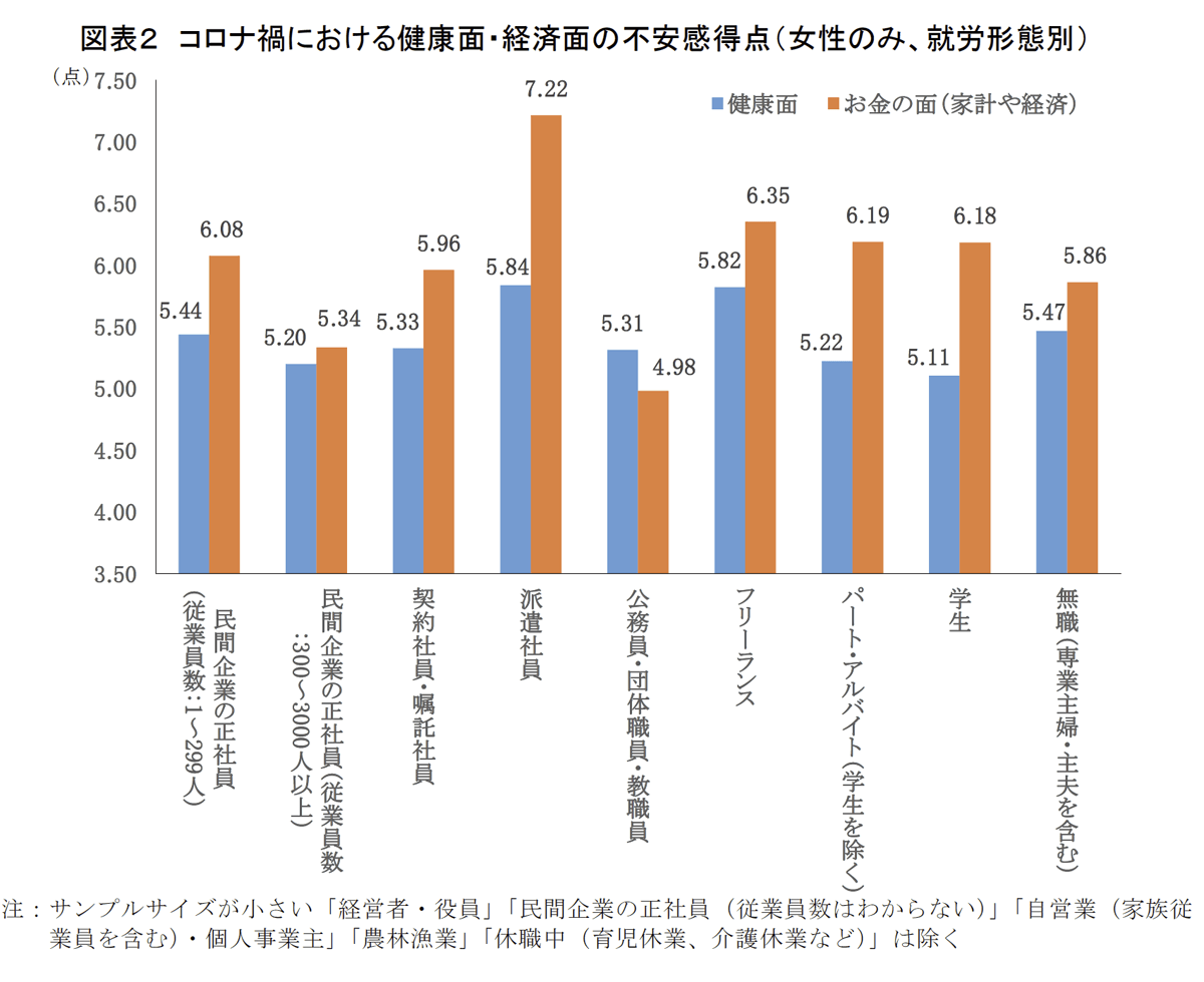 しかし「お金」(以下、「経済面」)の不安については、健康面やつながり面に比べ て高いことに加え、女性においては第2回調査から第3回調査で微増している。経済 面への影響、すなわち収入や家計への影響は、健康やつながりにおける影響に比べて 発生にタイムラグがあること、新型コロナウイルスを押さえ込めても直ちに課題が解 消するものではなく、問題が長期化する可能性を示唆しているともとらえられる。実 際、今回のコロナによる不況は特に女性の就労に大きな影響を及ぼしているとされて おり、こうした経済面での不安の高さはそれらを反映しているともいえる。女性のみ を就労形態別にみると、特に女性の占める割合の高い派遣社員で最も健康面・お金面 での不安が高いなど、困っている人と困っていない人の格差が拡大していると推察さ れる(図表2)。