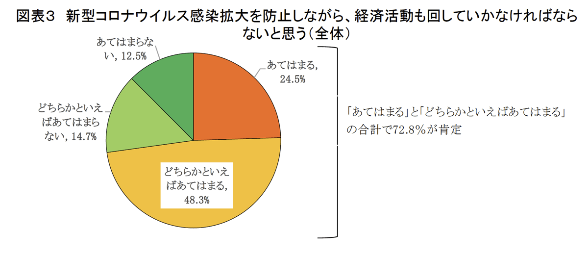 こうした中で、今回のコロナ禍では、様々な局面で感染拡大防止と経済活動維持 の線引きをどこで行うかという選択を迫られている。GoTo キャンペーンの中止につ いてもそうした議論の一環として行われたといってよい。こうした中、第3回調査時 点では「新型コロナウイルス感染拡大を防止しながら、経済活動も回していかなけれ ばならないと思う」との設問に対しては、「あてはまる」とした人が24.5%、「どちら かといえばあてはまる」とした人が48.3%で、72.8%の人が肯定している(図表3)。