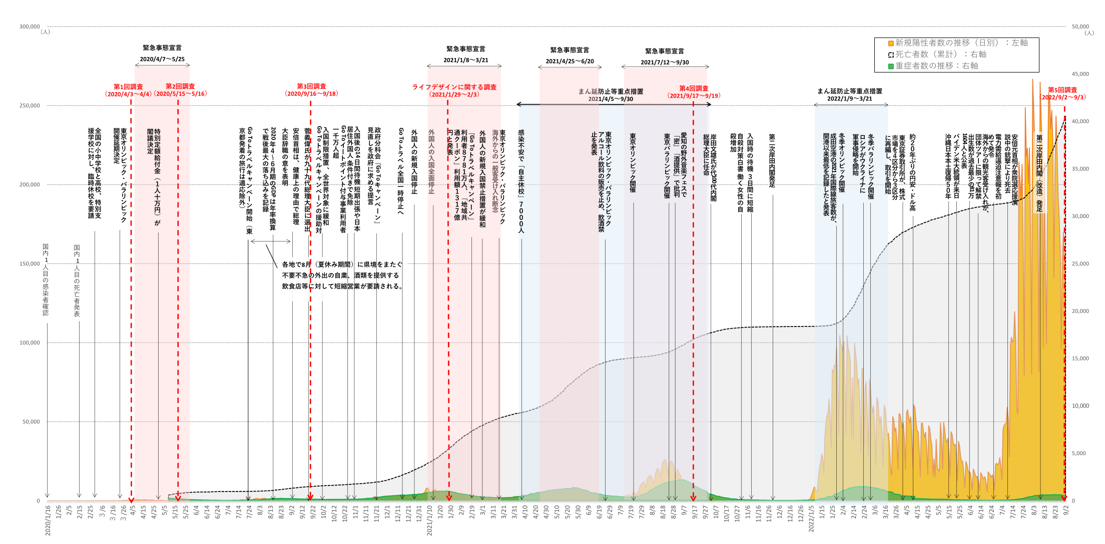 調査実施までの国内における新型コロナウイルスの感染拡大をめぐる発生動向に関する経緯(2020年1月16日~2022年9月2日)は下記のとおりです。