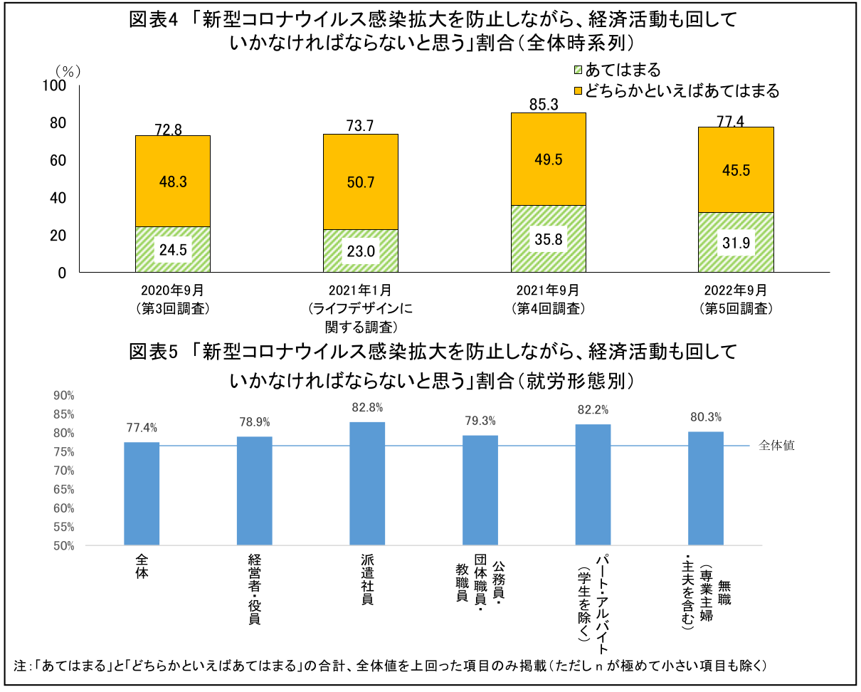 本調査では、第3回調査時点から「新型コロナウイルス感染拡大を防止しながら、経済活動も回していかなければならないと思う」との意見についてたずねています。これに2021年1月に「ライフデザインに関する調査」で同様の質問文でたずねたものを併せて4時点の比較を行ったところ、「非常にそう思う」と「まあそう思う」の回答の合計値は第4回調査までは上昇傾向にありましたが、直近の第5回調査時点では77.4%と1年前を7.9ポイント下回りました。ただし、「非常にそう思う」とする割合は31.9%と、比較的高水準を保っており、長引くコロナ禍において、経済活動を再開しなければならないとの意識を持っている人が多いことがうかがえます。第5回調査時期の直前に感染の第7波があり、従来になく感染者数が多かったことも、全体値が1年前を上回らなかった背景にあるといえそうです。