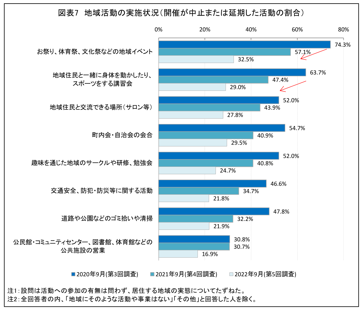図表7は、感染拡大後の地域活動の実施状況について、特に開催を「中止している(または延期の発表がされている)」とした回答を、2020年9月調査、2021年9月調査の結果と比較したものです。本調査結果からも、各活動において、中止や延期しているケースがこの2年半で減少していることが分かります。また、活動の実施方法についてたずねた結果からは(図表省略)、「全員が直接対面で実施」だけでなく「時間を短くして実施」や「二部制や複数日設けるなど回数を増やして実施」といった多様な方法により実施していることが分かっています。未だ感染拡大の波は繰り返されているものの、ワクチン接種の普及や感染対策の定着により、ウィズコロナの暮らしが認識の上でも実態としても日常化したと言えるのではないでしょうか。