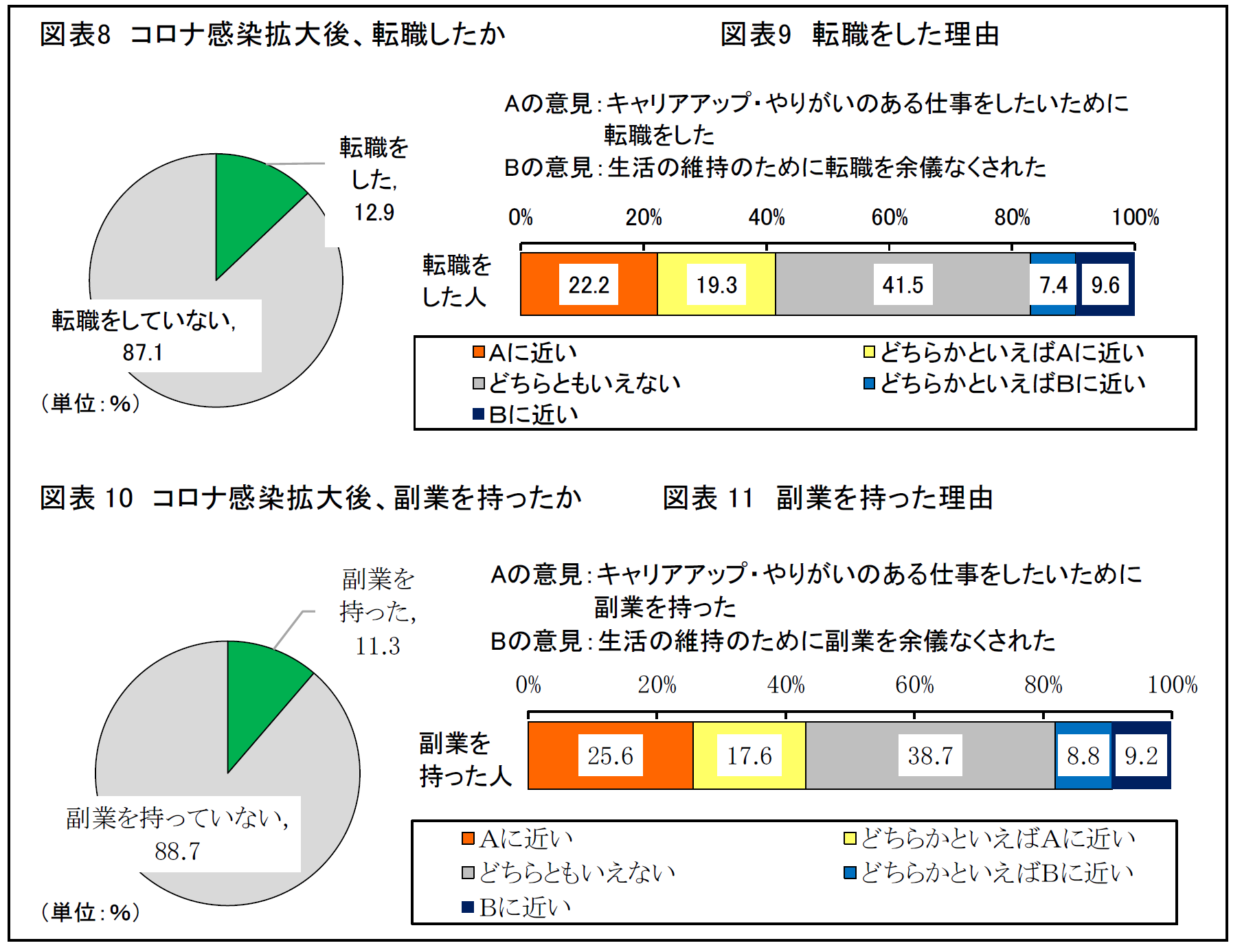 こうした中で、実際に感染拡大後に転職や副業をした人がどの位いるでしょうか。働いている人のうち、「転職をした」人は12.9%(図表8)、「副業を持った」人は11.3%(図表10)です。その理由をそれぞれたずねたところ、転職、副業いずれについても、「キャリアアップ・やりがいのある仕事をしたいため」が「生活の維持のため」を上回っています(転職については図表9、副業については図表11)。