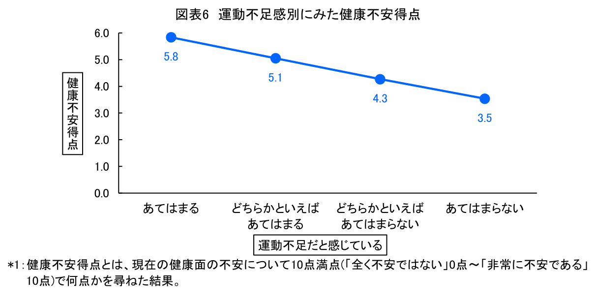 最後に、運動不足感と健康面の不安との関係を図表6に示す。これをみると、運動不足だと感じている人ほど健康面の不安得点が高い。健康不安に影響を与えるであろう要素はさまざまあるが、運動不足もそのひとつである可能性がある。健康不安を軽減するためにも、運動不足を解消する必要があるといえる。