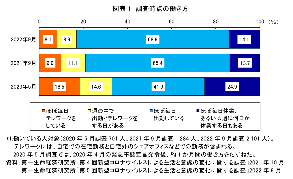 このような政策移行期に、当研究所では5回目の「新型コロナウイルスによる生活と意識の変化に関する調査」を実施した。本調査をもとに本稿では、2020年に感染拡大後に普及したテレワークの定着状況を確認するとともに、今後のWithコロナ時代の働き方を展望する。