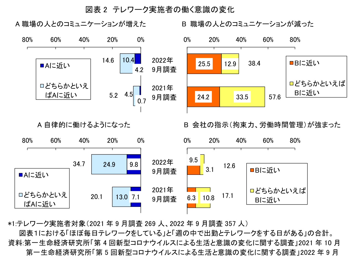 働いている人全体ではテレワークをしている人は限定的であるものの、テレワーク実施者に注目すると、コミュニケーション面や業務遂行面で、テレワークに適応して生き生きと働いている人が増えているのではないかと思われる。