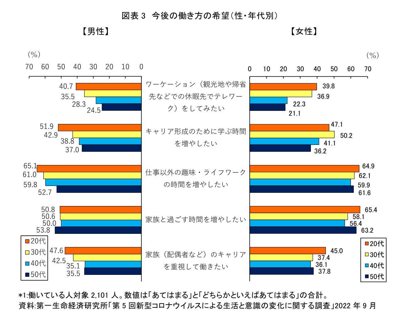 他方、「仕事以外の趣味・ライフワークの時間を増やしたい」「家族と過ごす時間を増やしたい」という人は、男女ともにどの年代も半数以上に上る。大きな社会変化を経験し、自分の生活を見つめ直して、自分なりにワークライフバランスを大切にしつつ暮らしていきたいと思った人も多いことと思われる。