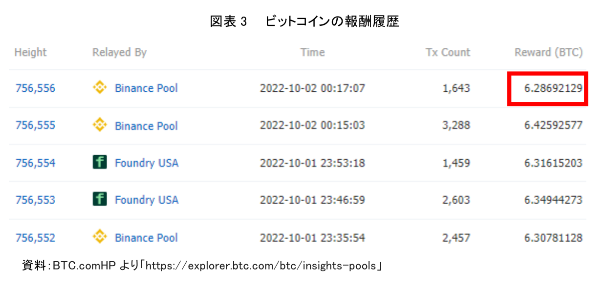 さらに、マイニングした報酬としてマイナーが受け取る暗号資産について、どのPOWマイナーがいつどのくらいの報酬を得ているのかを確認できる。図表3赤枠の報酬は6.286BTCとなっているため、1BTC=282万円(図表1のBTCの円換算価値)から計算すると、マイナーであるBinance Poolが他のマイナーとの計算競争に勝利し、2022年10月2日に約1,770万円の報酬を得たことがわかる。