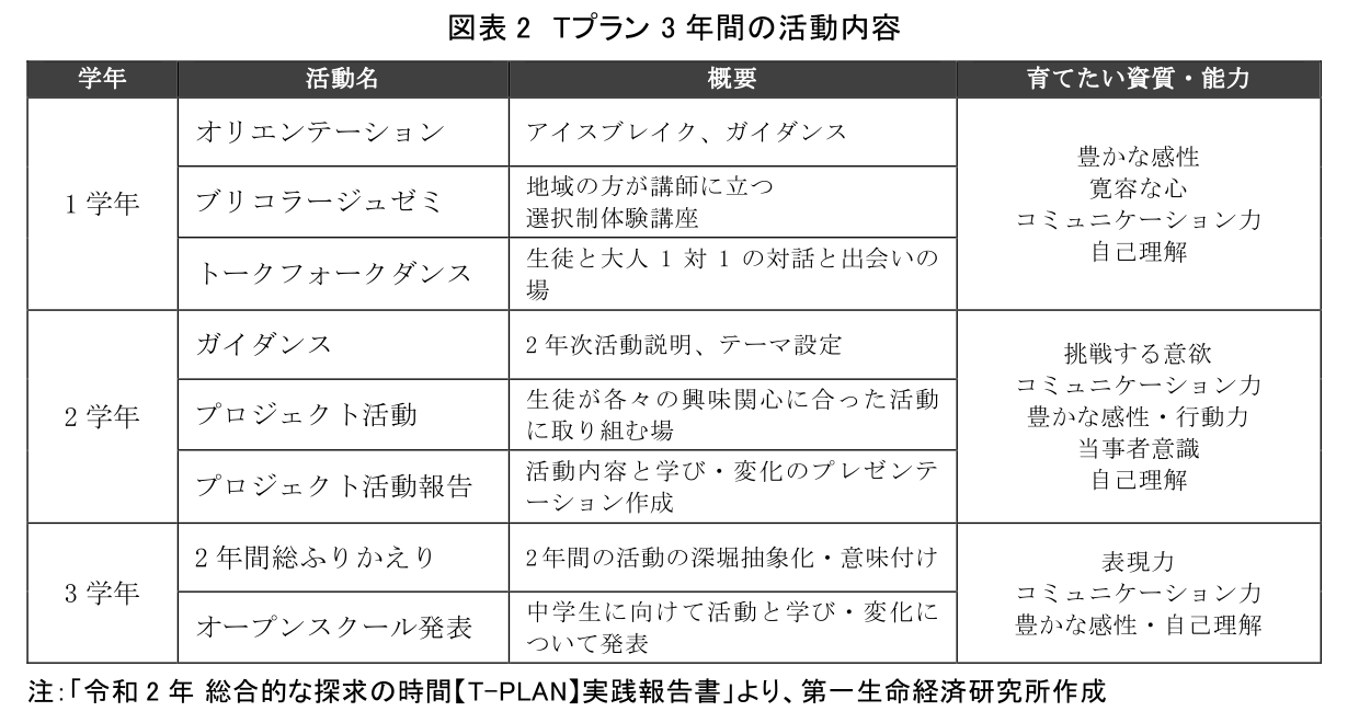 「Tプラン」は、教科や科目の枠を超えた横断的・総合的な授業である「総合的な探求の時間」(注3)に実施される3年間の系統プログラムである(図表2)。