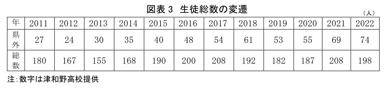 津和野高校には、現在74名(2022年5月1日現在)の生徒が県外から「留学」している。その数は魅力化事業が開始されてから年々増加している(図表3)。県外の生徒はなぜ、わざわざ津和野町にやってくるのだろうか。都心で生まれ育ち、他の地域のことを知りたいと津和野町に留学した生徒。全国の地域留学できる高校を調べ、津和野高校の取り組みに惹かれ、両親を説得してやって来た生徒。ある生徒は、コロナ禍で思い描いていた学生生活を送ることができず、他の選択肢がないか調べる中で、単年留学の制度(注5)を知り、津和野高校への留学にたどり着いたという。