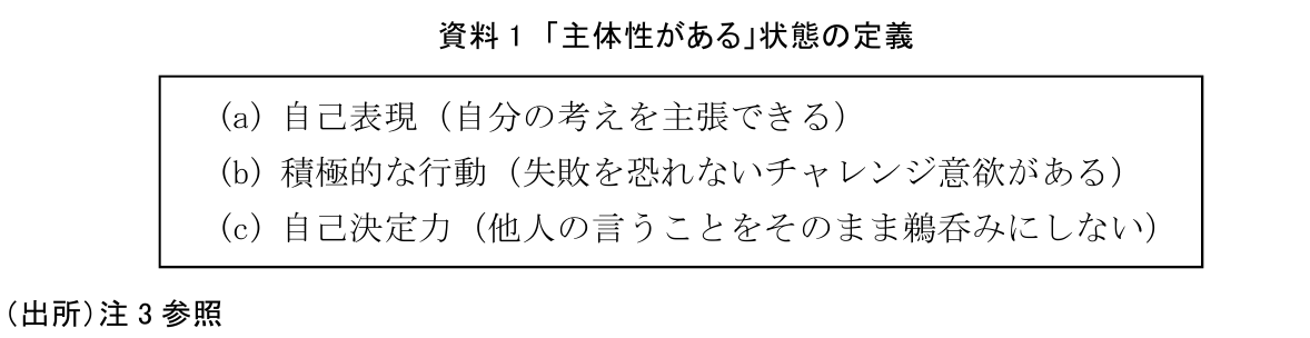 なお、「主体性」については各所により様々な定義がなされているが、心理学における主体性を測る尺度(注3)としては、「自己表現」・「積極的な行動」・「自己決定力」等に代表されることから、本稿では以下を「主体性がある」状態として定義することとしたい(資料1)。