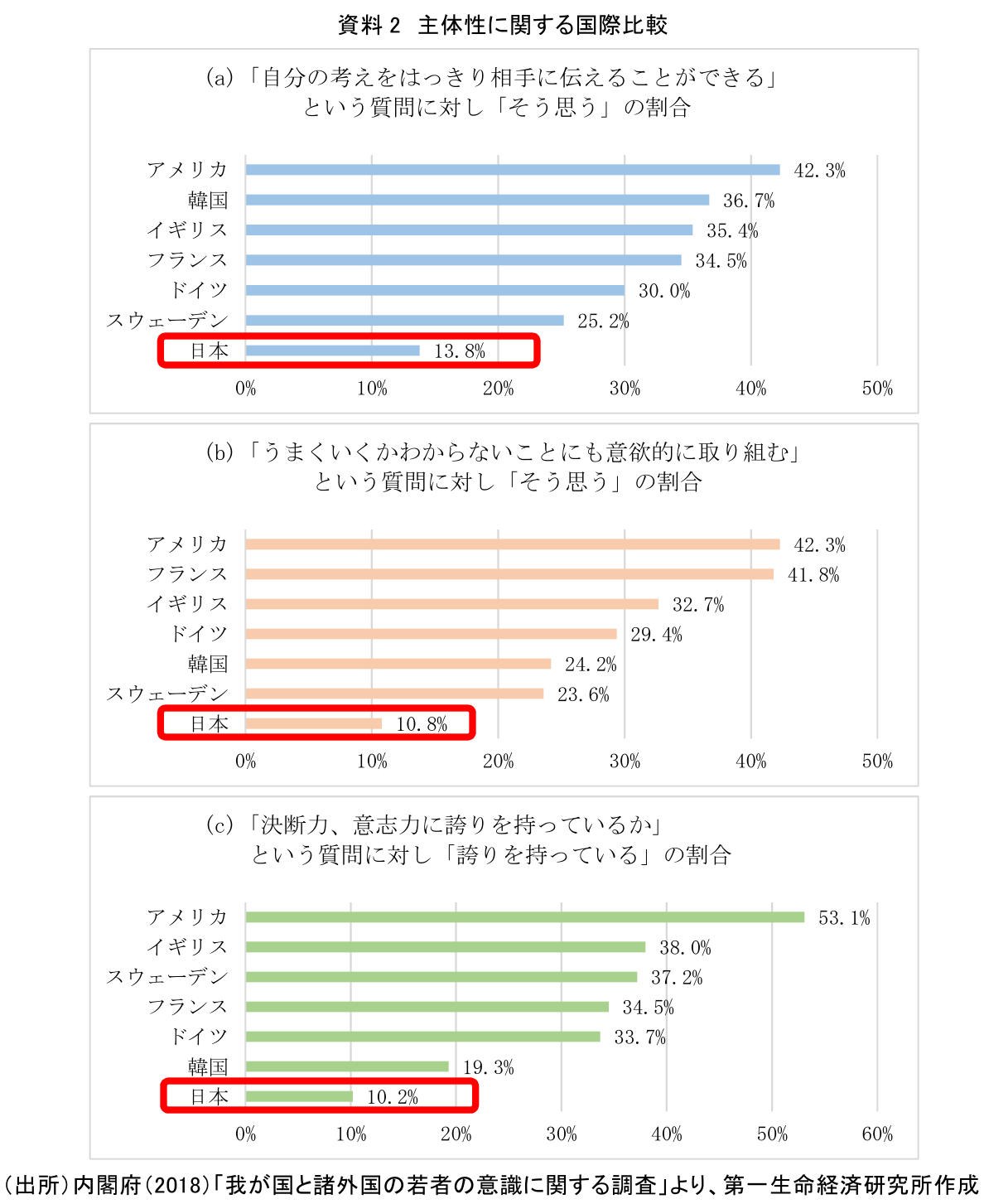 「(a)自分の考えをはっきり相手に伝えることができる」(自己表現に該当)という質問項目に対し、日本以外の6か国では「そう思う」の割合がいずれも25%以上であるが、日本は13.8%と7か国中最低である。また、「(b)うまくいくかわからないことにも意欲的に取り組む」(積極的な行動に該当)の質問項目についても、日本は10.8%と最低、さらに「(c)決断力、意志力に誇りを持っているか」(自己決定力に該当)の質問項目についても「誇りを持っている」と回答した割合は日本が10.2%で最低となっている(資料2)。