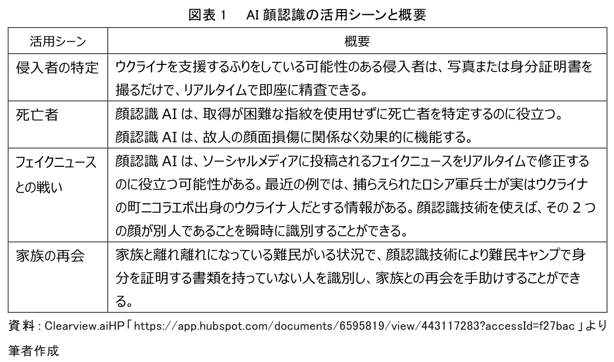 ウクライナで活用されているAI顔認識は、侵入者の特定、死亡者、フェイクニュースとの戦い、家族との再会といった様々な用途に利用が進んでおり、その概要は図表1の通りである。
