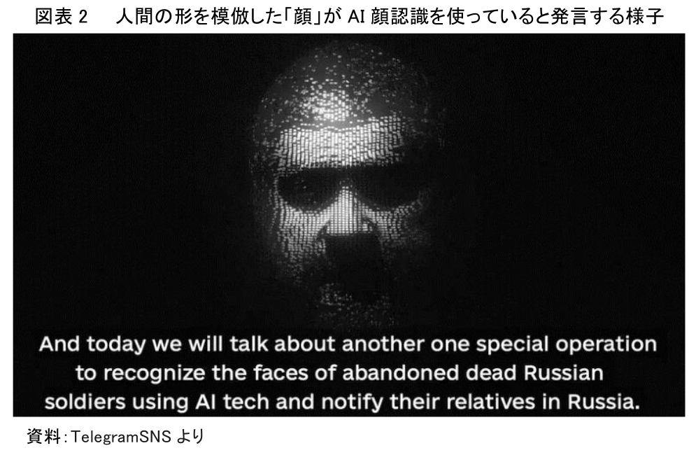 ウクライナが戦時下でAI顔認識を活用している事例として、ウクライナのサイバー攻撃部隊であるIT ARMY of Ukraine(以下ウクライナIT軍)が2022年4月5日に公開した動画をとりあげる。この動画のなかで、人間の顔を模倣した司会者は、くぐもった声で以下のように発言している。「そして今日はもう一つの特別作戦、AI技術を使って死亡し放置されたロシア兵の顔を認識し、ロシアにいる親族に通知することについてお話します」(図表2)。