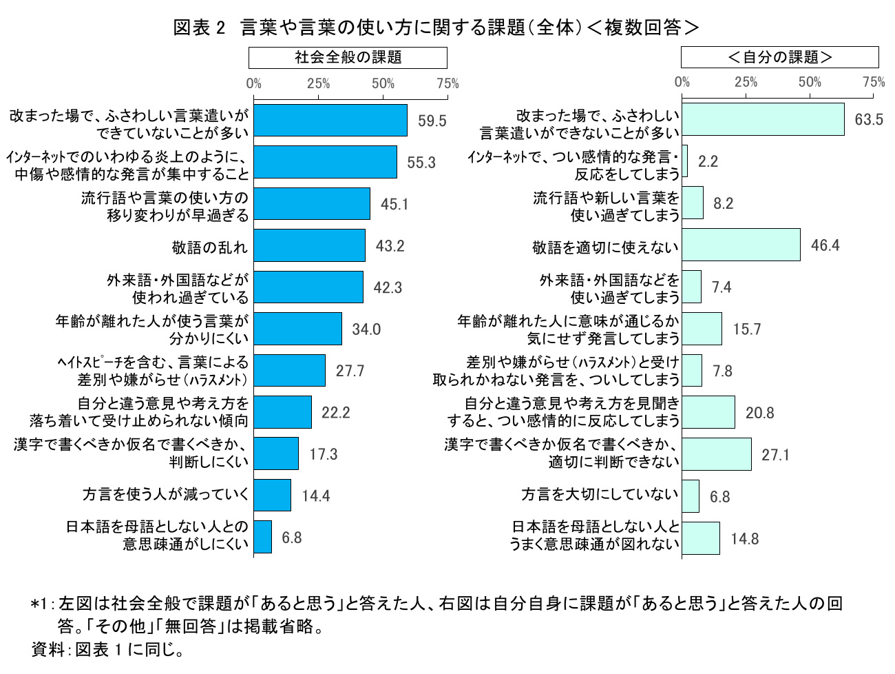 では、社会全般、あるいは自身に課題があると答えた人は、具体的にどのようなことを課題だと感じているのか。まず、社会全般の課題についてみると、最も多かったのは「改まった場で、ふさわしい言葉遣いができていないことが多い」(59.5%)で、「インターネットでのいわゆる炎上のように、中傷や感情的な発言が集中すること」(55.3%)がこれに次いでいる(図表2左図)。一方、自分自身の課題でも「改まった場で、ふさわしい言葉遣いができないことが多い」(63.5%)は最も多く挙げられている(図表2右図)。フォーマルな場面での言葉の使い方にかかわる項目は双方で最も多く挙げられている。