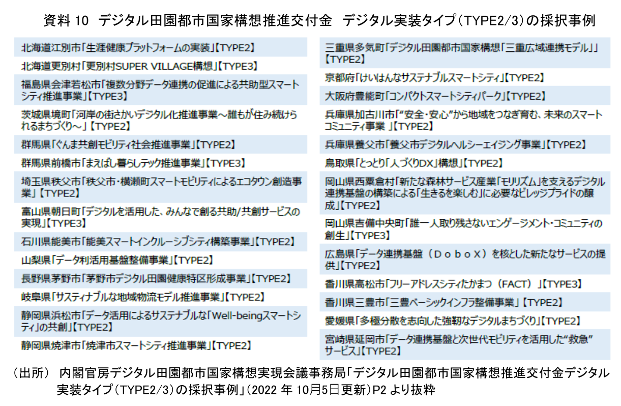 - デジタル田園都市国家構想推進交付金は、デジタルを活用して地域の課題解決や魅力向上に向けた意欲ある地域の取組みを国が支援する交付金を指す。本交付金にはデジタル実装タイプと地方創生テレワークタイプの2つの種類がある。デジタル実装タイプは、他の地域で確立された優良モデルを活用するType1事業と、他地域のモデルケースとなり得るType2/3事業がある。Type2/3事業については、2022年6月に27団体(都道府県7団体、市町村20団体)、国費49.1億円の事業が採択されている。
