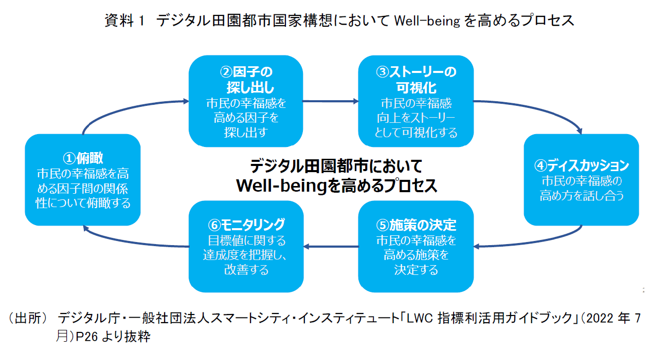 前回も掲載した資料であるが、デジタル田園都市においてWell-beingを高めるプロセス(以下、「プロセス」)が示されているので、今回はそれに沿って説明していく(資料1)。