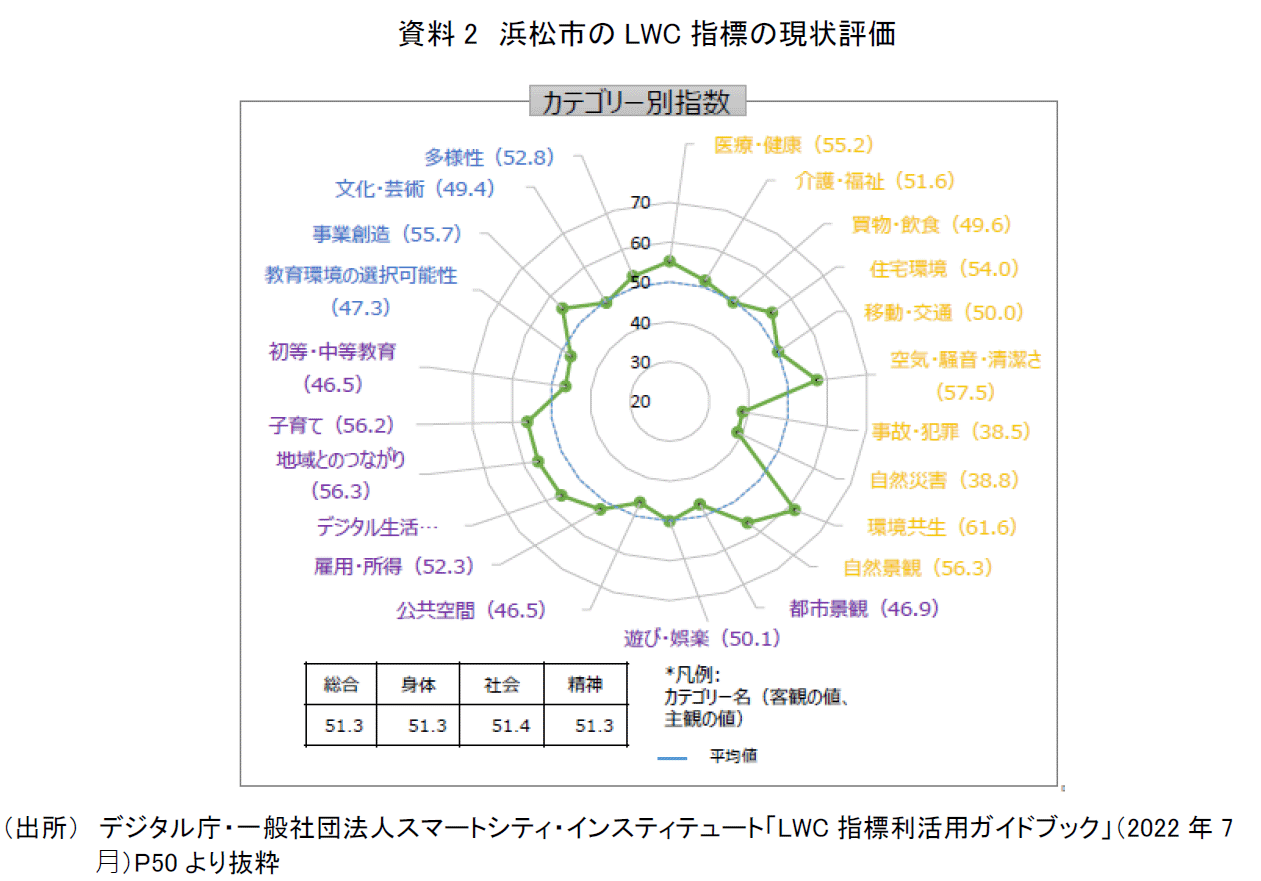 今回紹介する静岡県浜松市と福島県会津若松市は、内閣官房が選定する「デジタル田園都市国家構想推進交付金(注2)デジタル実装タイプ(TYPE2/3)の採択」自治体であるとともに、デジタル庁が提供する「LWC指標利活用ガイドブック」(各自治体がLWC指標について理解するとともに、指標を活用してWell-being向上を目指すためのノウハウを提供)のユースケースに採用された自治体でもある。