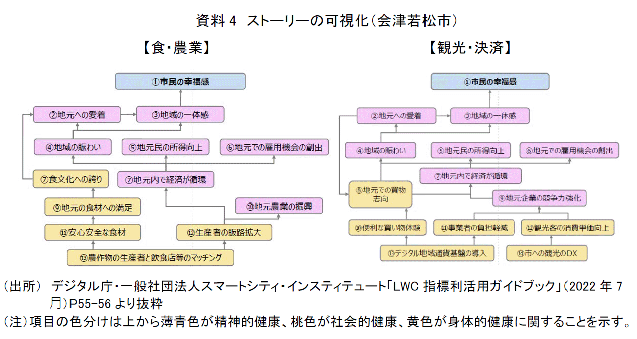 会津若松市の事例では、食・農業と観光・決済に関する取組みから市民の幸福度向上に至るストーリーを可視化している(資料4)。