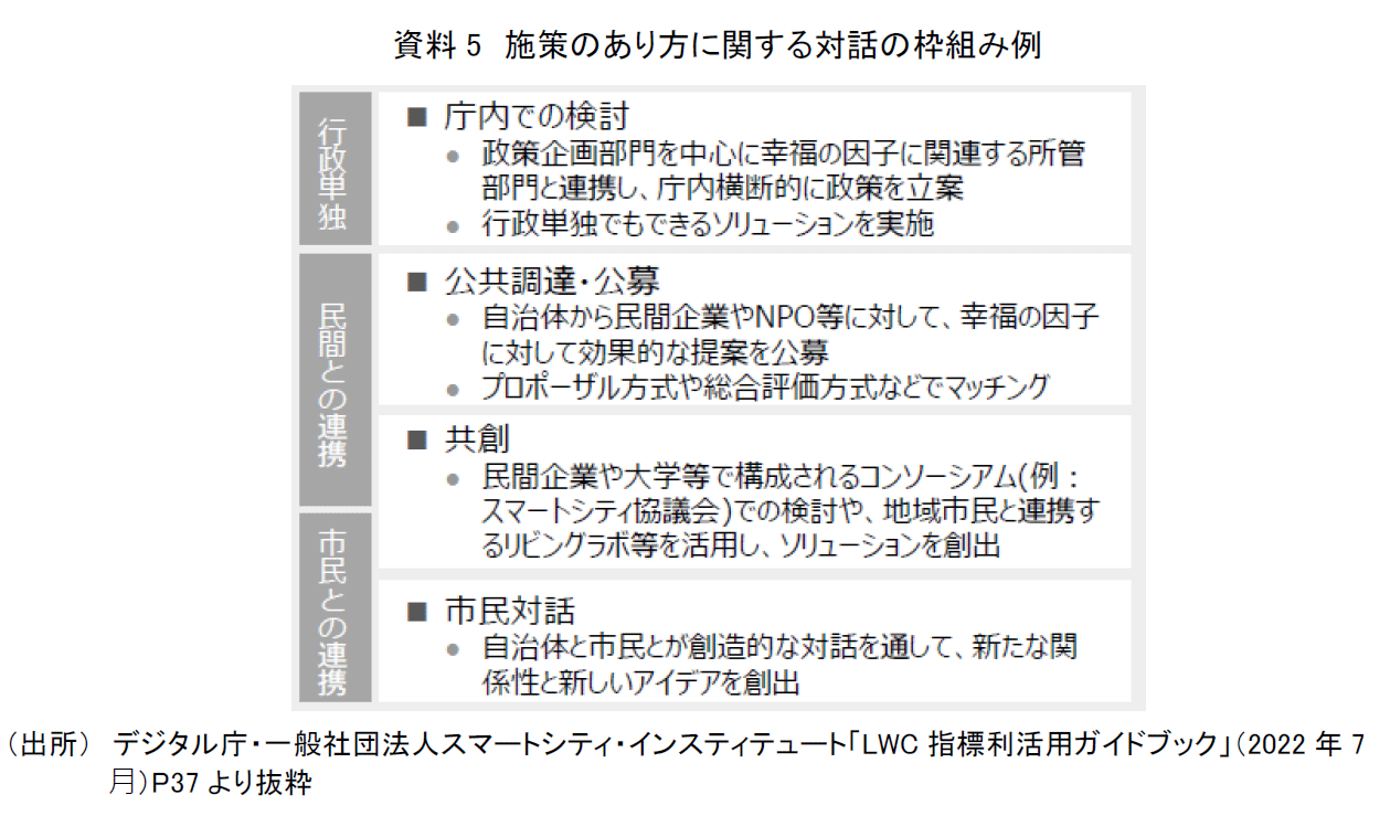 民間企業と連携する施策であれば、自治体から民間企業やNPO等に対して幸福の因子向上に効果的な取組みを「公募」することが挙げられている。また、民間企業や大学等で構成されるコンソーシアムとの「共創」も類型として挙げられている。