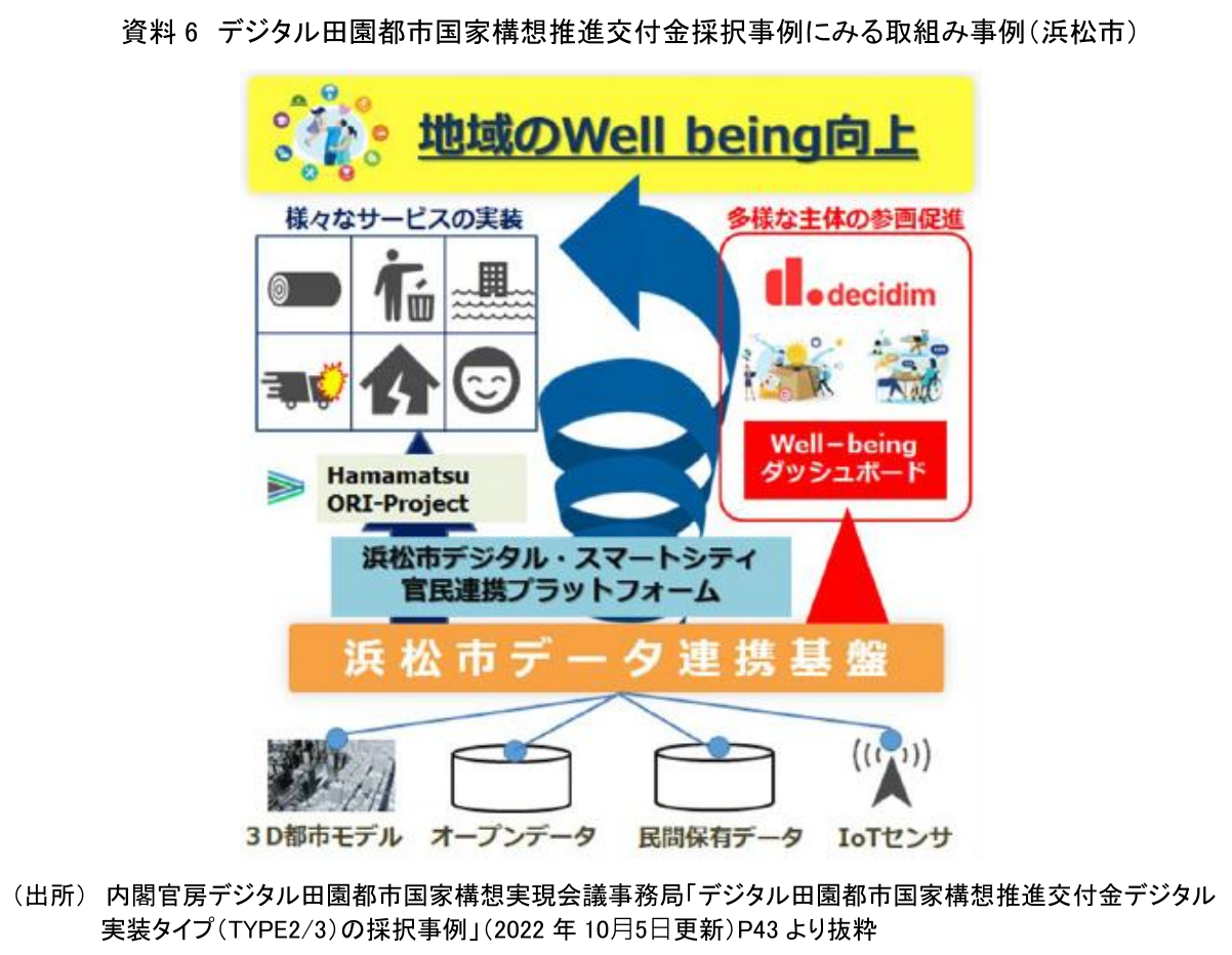 まず、浜松市の取組みであるが、資料6にあるように「地域のWell-being向上」を最上位に掲げている。採択事例の説明資料では「多様な主体の競争による持続可能な『Well-beingスマートシティ』の実現」に向け、①都市を支えるデジタルインフラの整備、②データ連携基盤を活用したサービスの官民共創と地域実装、③市民が支えあい、Well-beingを向上できるまちづくりの推進を一体的に進める、とされている。