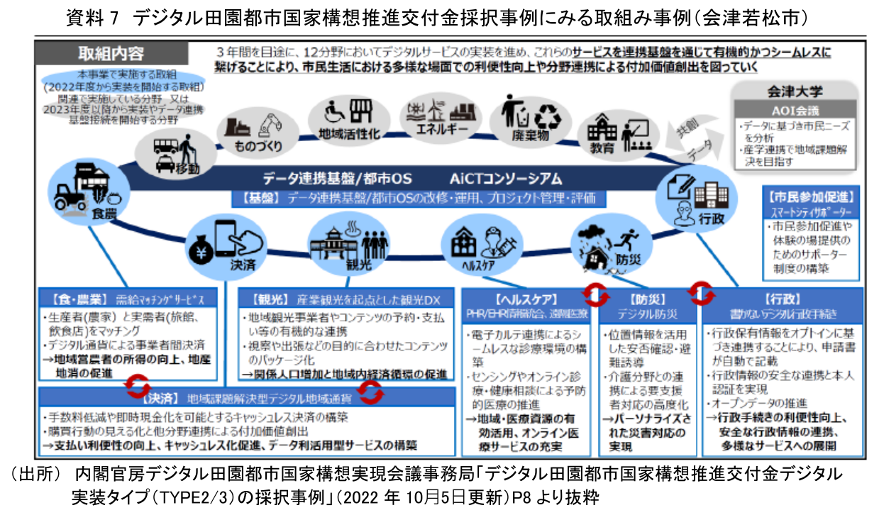 次に会津若松市の取組みであるが、今後3年をめどに図にある12分野においてデジタルサービスを実装し、市民生活の多様な場面での利便性向上や付加価値創出を行っていくとされている(資料7)。