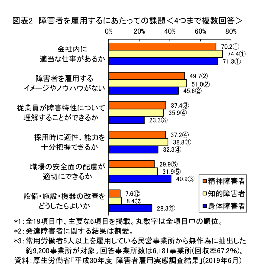 では、障害者を雇用するにあたっては、どのようなことが課題になっているのだろうか。図表2には、厚生労働省が民営事業所に対し、身体・知的・精神障害者雇用それぞれの課題について尋ねた結果を示す。