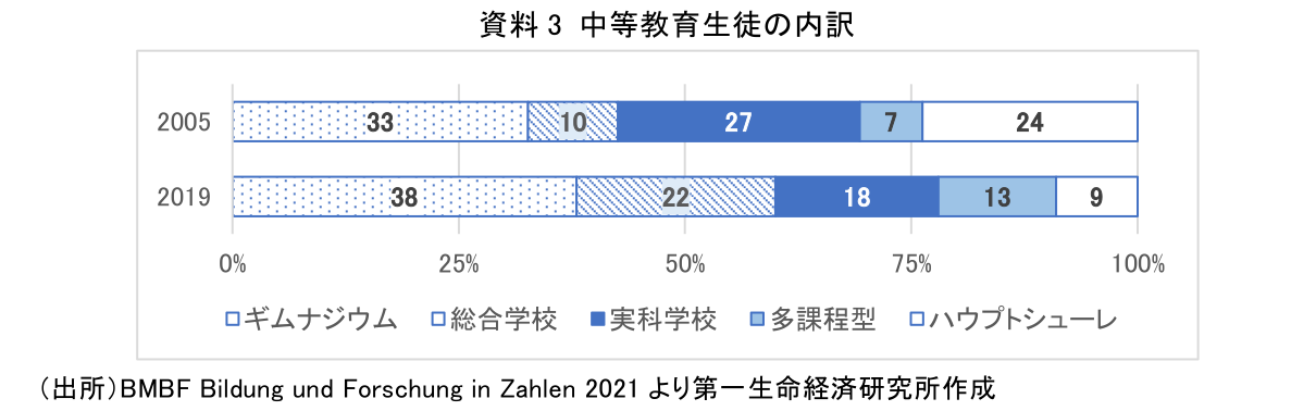 デュアルシステムに進む者の約4割は実科学校の修了生である(資料2)。以前は、ハウプトシューレと実科学校がデュアルシステムの主な供給源であったが、ハウプトシューレ修了生の割合は減少し、代わりにギムナジウムを修了した大学入学資格保有者が増加している。この要因の1つには、中等教育生徒の内訳の変化がある(資料3)。ドイツでは、大学進学率が2000年33.3%から2020年は56.6%に上昇するなど大学進学志向が強まっており、ギムナジウムや総合学校への進学者割合が増加している。代わりに、デュアルシステムへの主な供給源であった実科学校やハウプトシューレへの進学者割合が減少傾向にある。