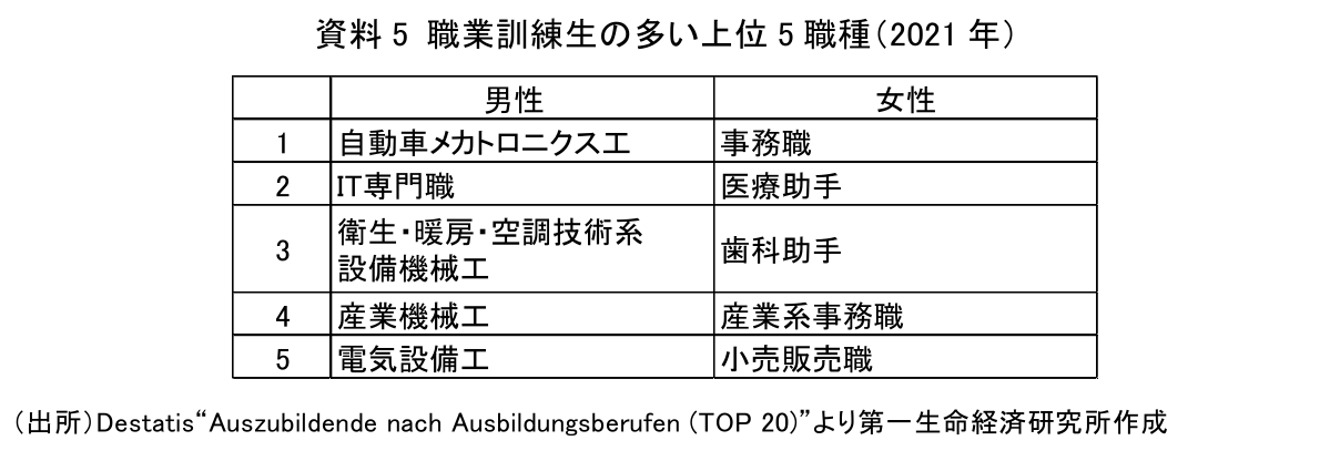 デュアルシステムの対象となる職種はドイツ連邦政府が認定しており、2021年10月時点で324職種ある。産業界のニーズも踏まえ、職種は随時入れ替えられている。訓練生の多い職種は資料5のとおりで、上位20職種に、男性では約6割、女性では約7割が集中している。